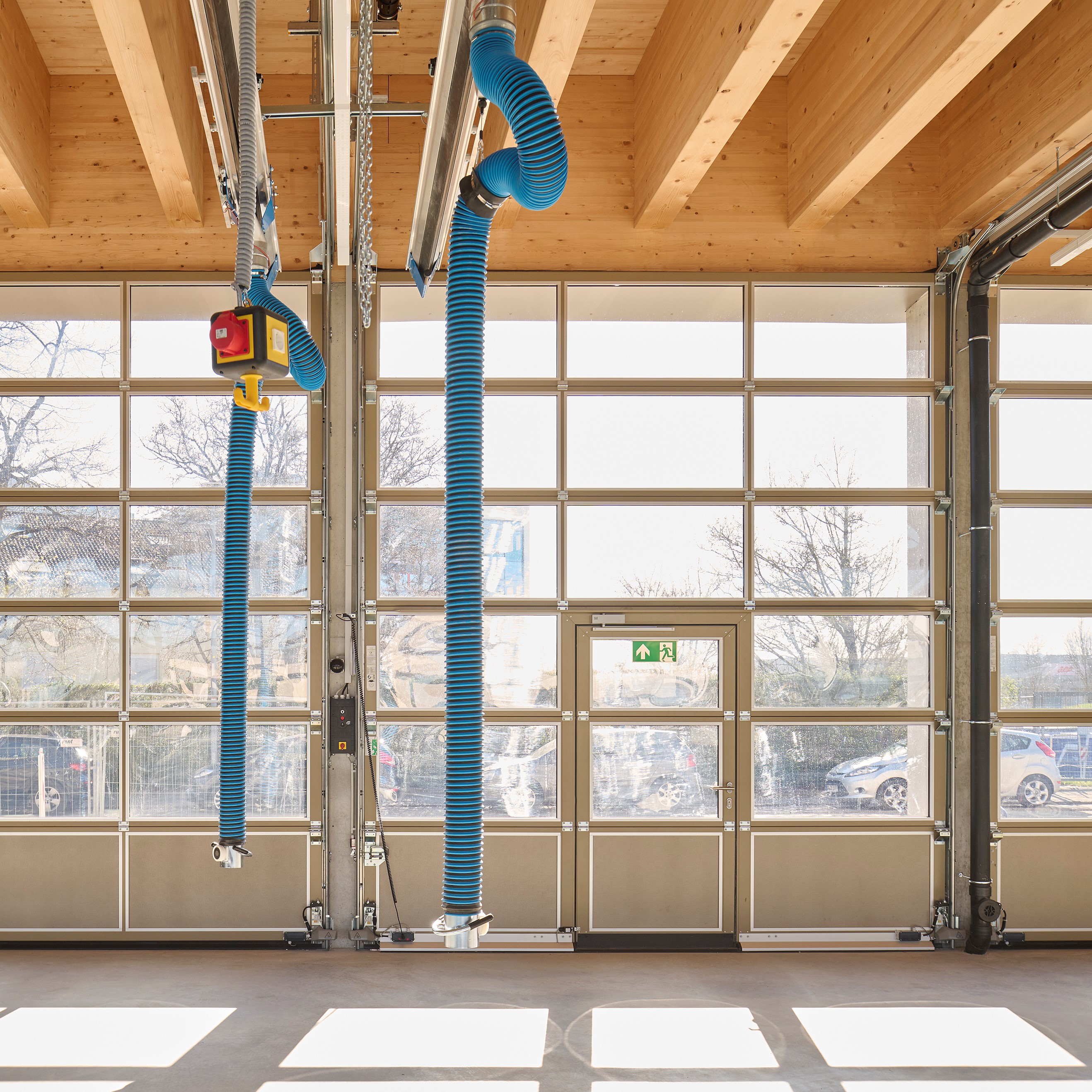 Auch das neue Ortsverbandsgebäude in Ostfildern – realisiert vom Staatlichen Hochbauamt Stuttgart – erfüllt besondere standortspezifische Nutzeranforderungen: Der Entwurf des Planungsteams setzt das Ortsverbandsgebäude auf die Fahrzeughalle. Diese von den bisherigen Standards abweichende, individuelle Neukonstruktion machte bei der beengten Grundstückssituation den Bau einer Fahrzeughalle erst möglich.